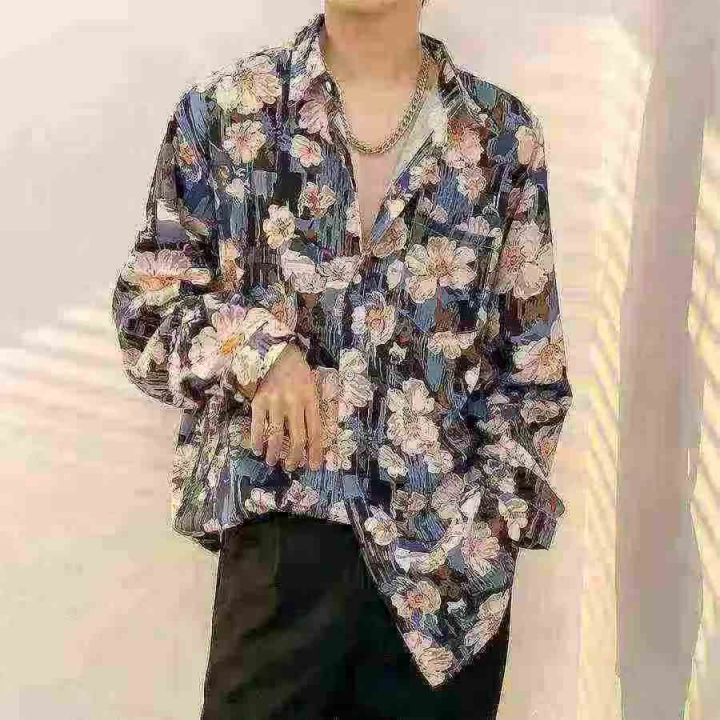 港风古着花衬衫男女复古痞帅百搭宽松设计感小众长袖衬衣,独立包装,码数S-...