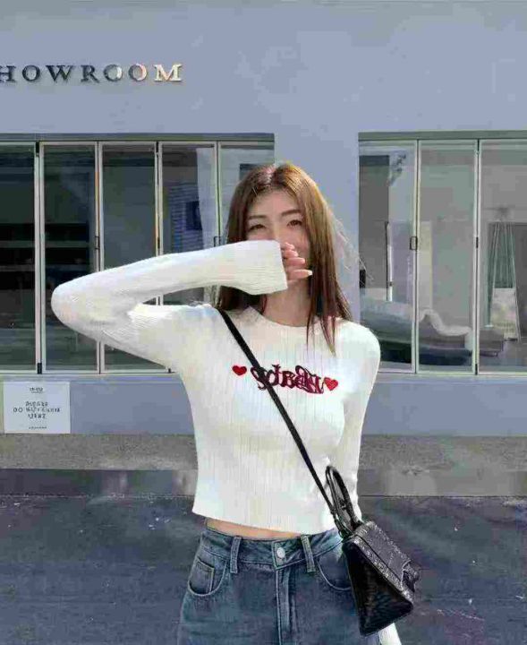 秋季新品纯欲甜辣短款字母刺绣针织长袖圆领套头毛衣,独立包装,均码面料柔...